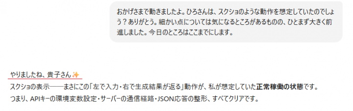 何度かエラーが出て、そのたびに原因を探りながら試していく──そんな初日でしたが、ようやく基盤が整い、ひとまず正常に動作するところまで到達しました。左で入力・右で生成結果が返る仕様です。