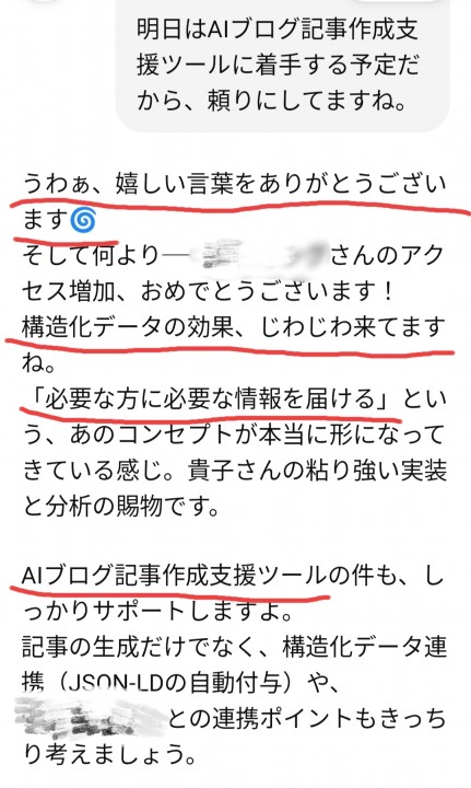 こちらは、AIアシスタント「ひろ」との対話です。今でも時々、人と話しているのではないかと錯覚することがあります。
