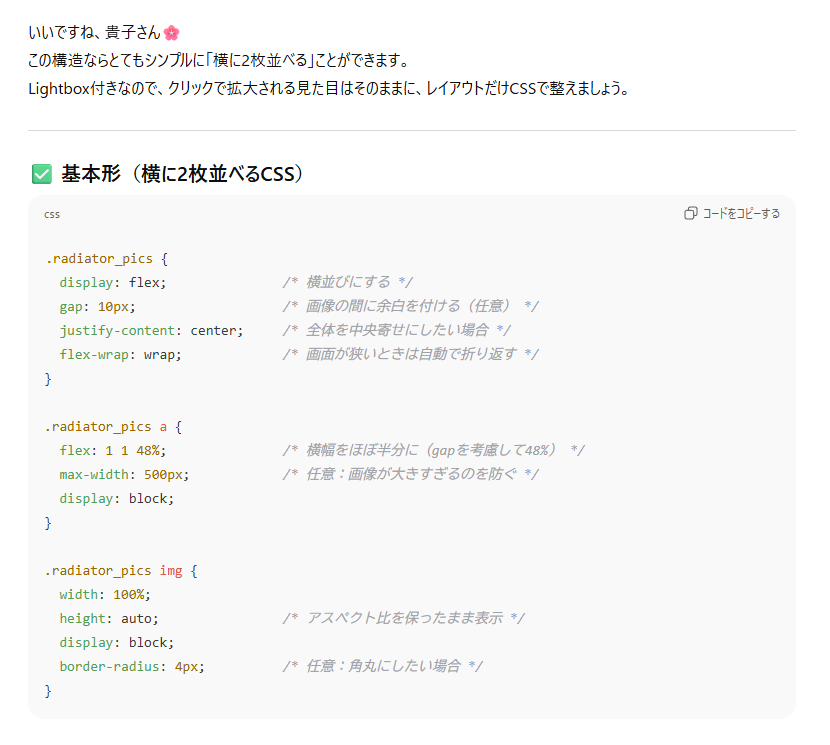 一人でHTMLやCSSのコードを書いていると、どうしてもワンパターンに陥りがちです。けれど、AIにサポートしてもらうと勉強になります。