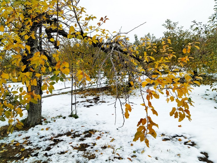 リンゴ畑を覆う白い雪と、黄色い葉のコントラストが美しかったです。