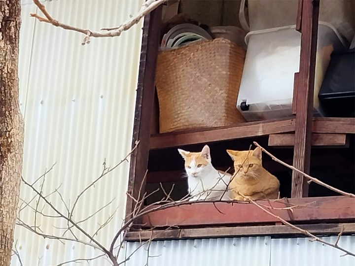 そしてこちら。二匹の猫ちゃんが窓際にちょこんと座って、通りを眺めていました。「外は寒そうだニャ〜」とつぶやいていたのか、真意は分かりませんが(笑)、可愛らしい光景でした。